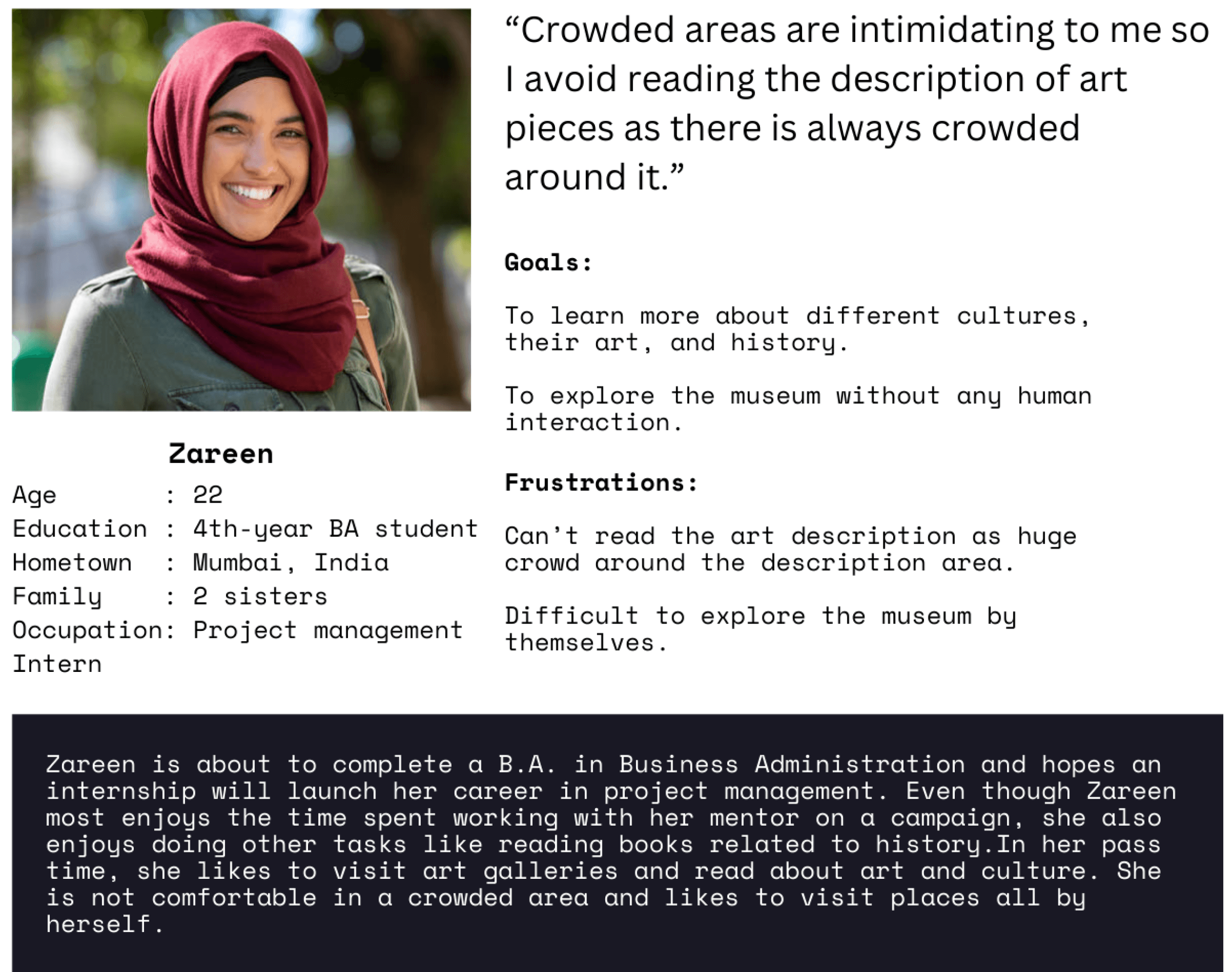 Zareen is a student who needs to listen to audio descriptions of art because she is socially awkward and does not enjoy human interaction much