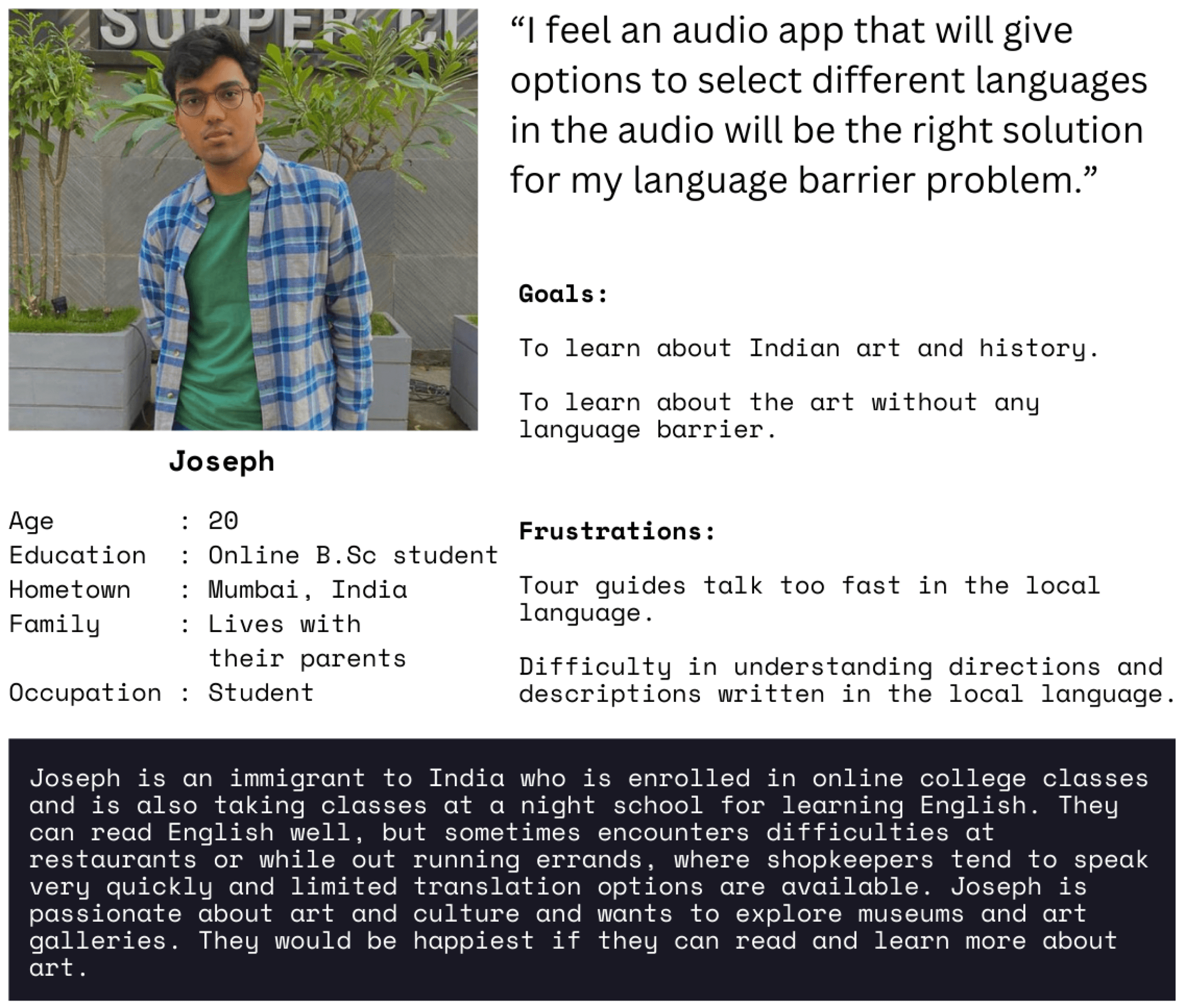 Joseph is an immigrant student who needs to listen to audio descriptions of art in his native language because he cannot understand/read descriptions in local language or can't understand the guide's explainations.