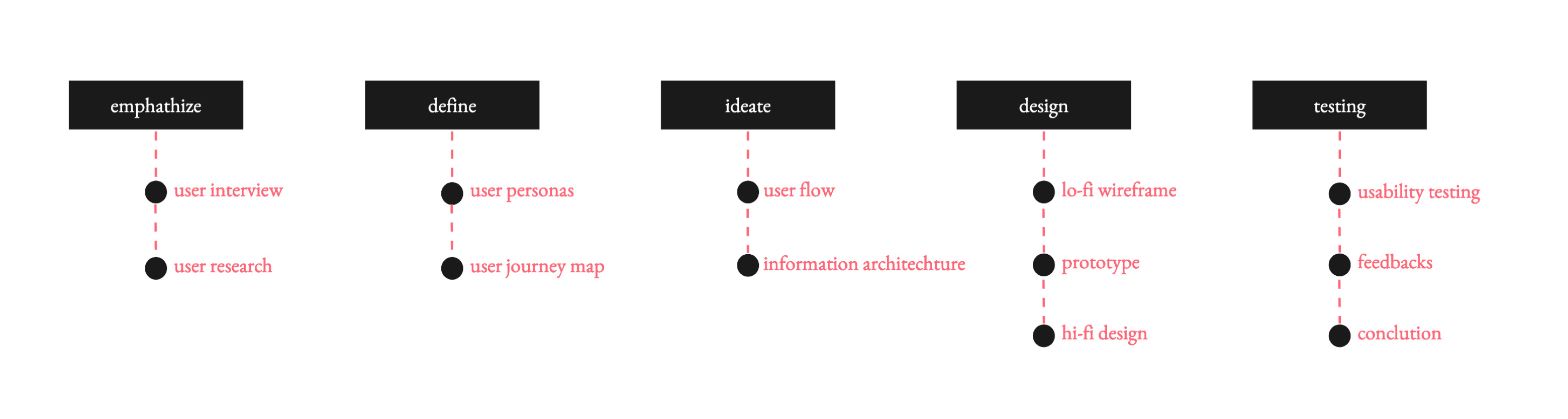 Conducting interviews, creating persons, low fidelity prototypes, interactions, high fidelity prototypes, and conducting usability studies.