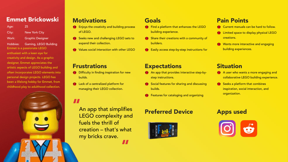 A pressing need for a user-friendly LEGO app that seamlessly guides builders of varied skill levels, enhances the virtual building experience with a tactile feel, maintains a healthy screen time balance, and efficiently organizes LEGO collections, catering to both enthusiasts and casual builders.