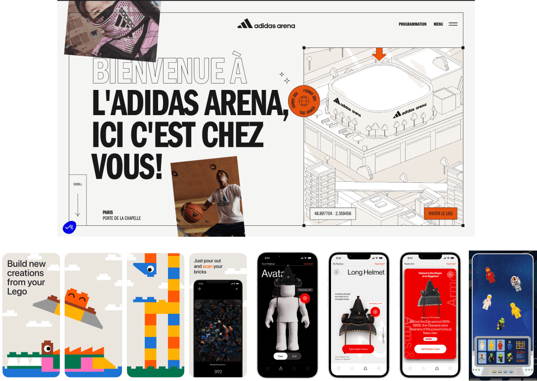 Shapes: Rounded corners, grids, Lego brick-like buttons/icons.