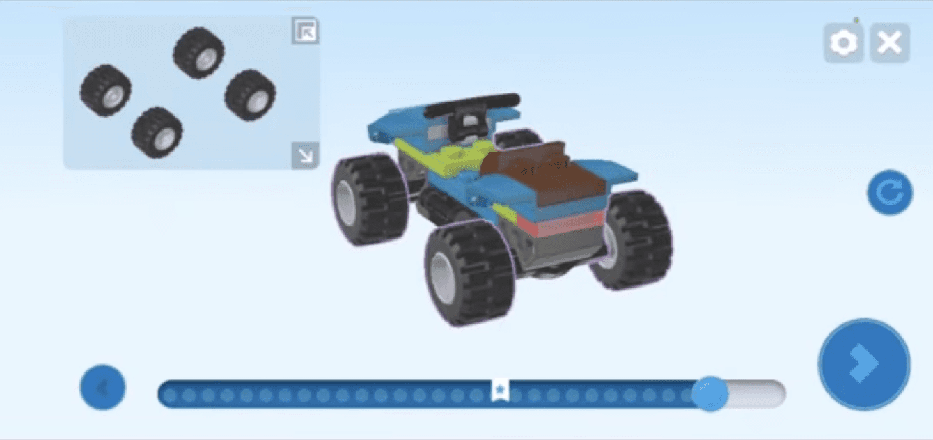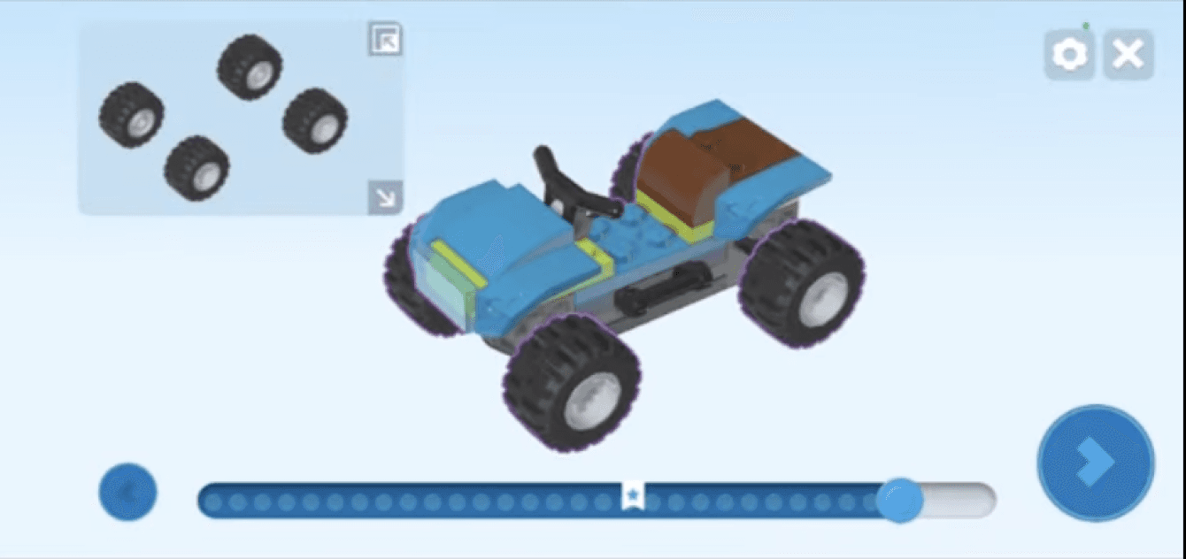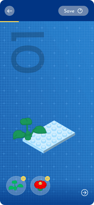 While user starts building a model, he can see “Steps”, Pieces available at that moment in step, yellow progress bar at top, and a save button..