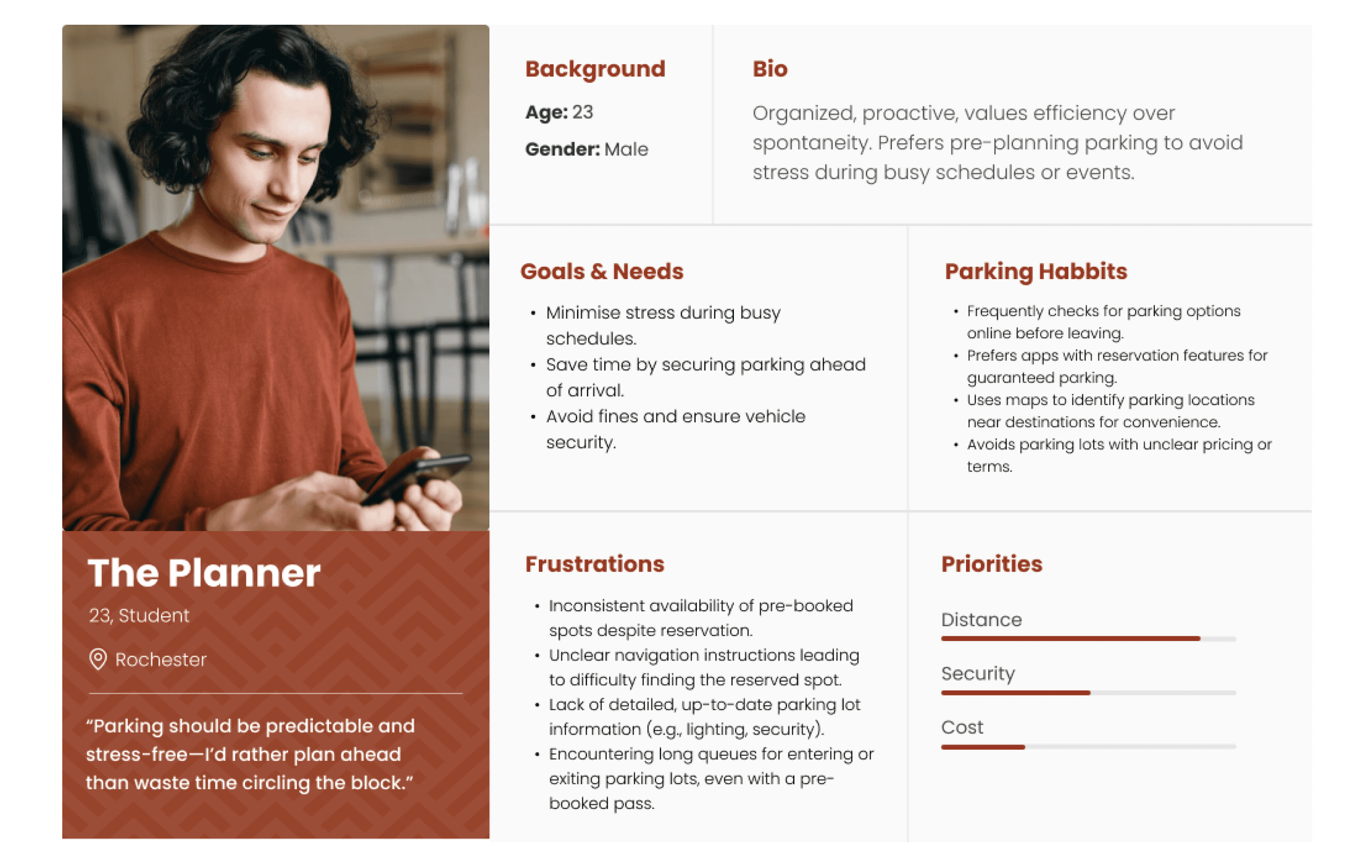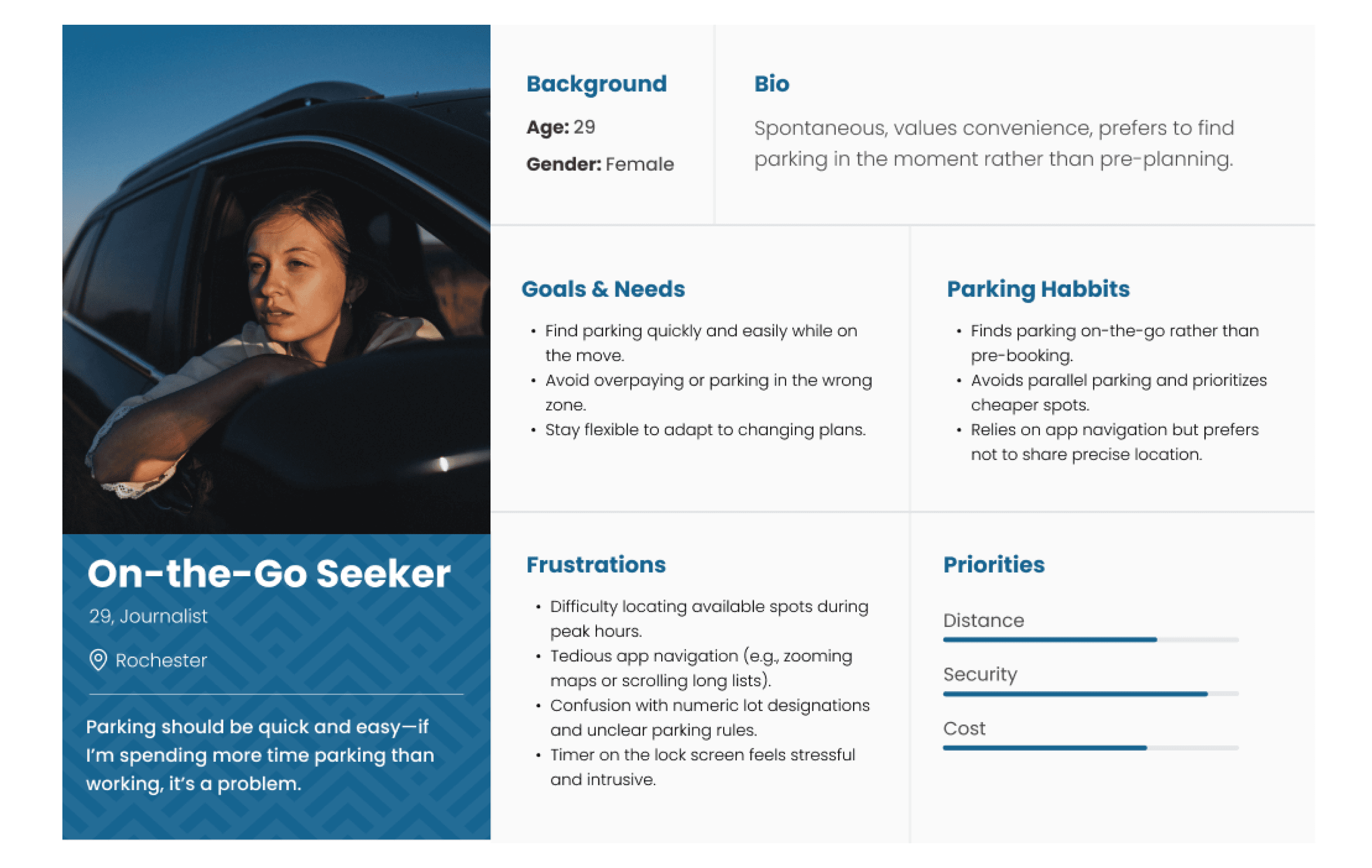 The On-the-Go Seeker values flexibility and convenience, using parking apps to find spots in real time. They prefer simple, intuitive navigation and adaptable solutions that fit their changing plans, seeing parking as a quick, functional part of their journey.