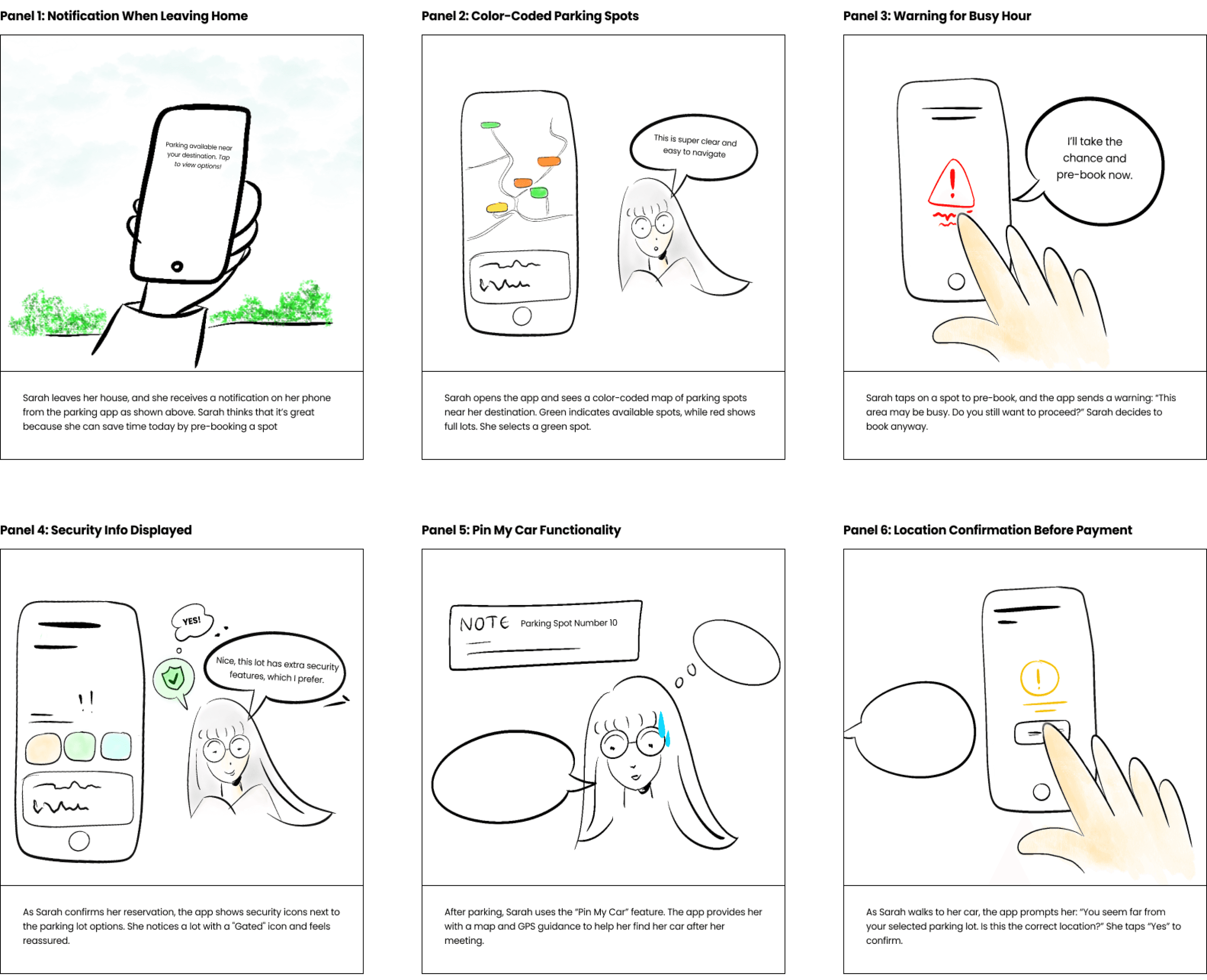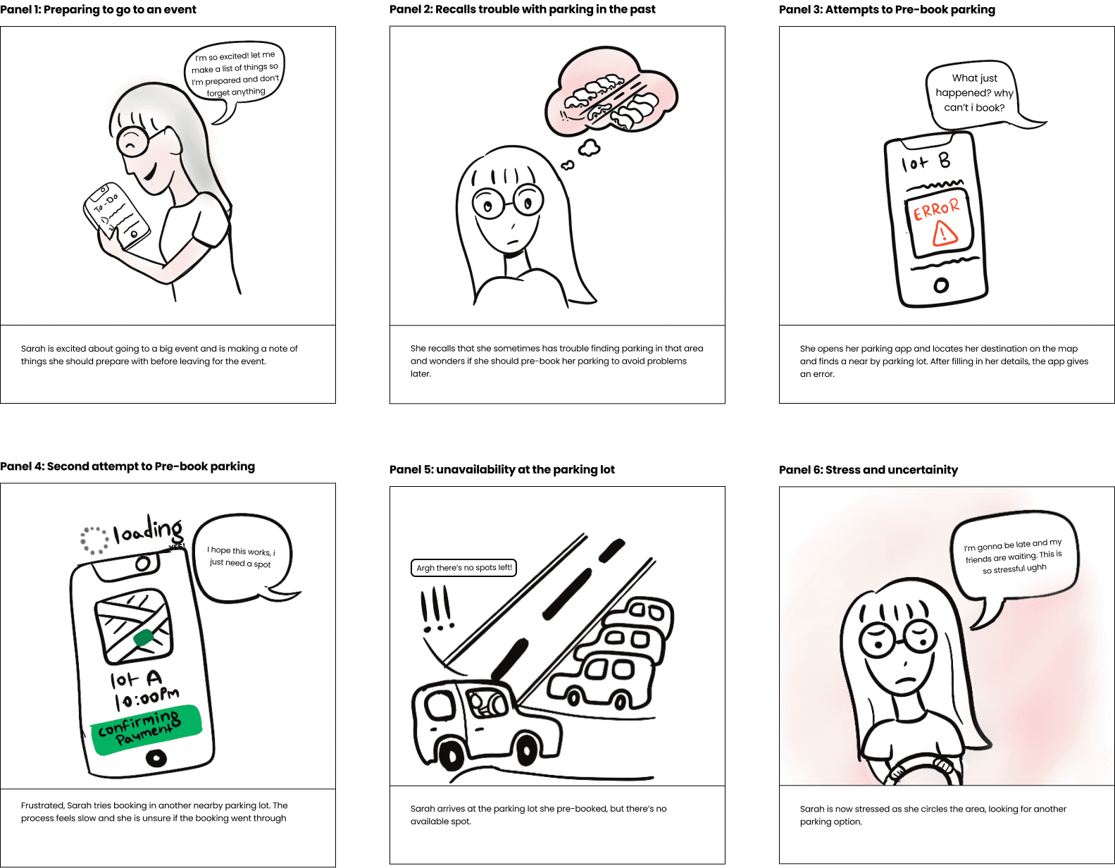 The problem storyboard highlights user frustrations with parking apps, from securing pre-booked spots to arriving at full lots.